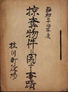 桂川町の公文書から、他自治体の公文書では見かけないような、あっても十指に満たないくらいの珍しいテーマの文書を紹介しましょう。まずはこちら、『掠奪物件に関する事蹟』です。