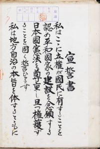 当時は草書体、いわゆる「崩し字」も日常的に使用されていますので、「主」を「立」に、「存」を「有」に誤った可能性が高そうです。ただ宣誓書の雛形からそうなっていたため、それを書き写した全員が同じ表現を使ってしまったのでしょう。公布されて日も浅い憲法の文言を確かめる手立てとして、当時どのようなものがあったのか、ネット社会の現在からは想像するのも難しそうです。ともあれ、情報の伝達・流通が、その量も経路も限られていた時代のエピソードと言えそうです。